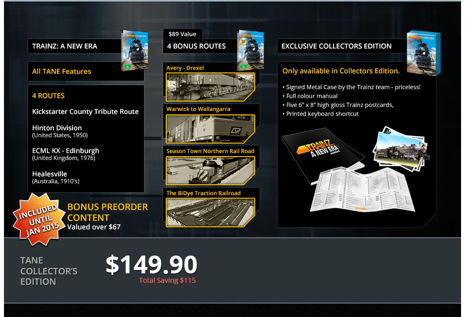 Trainz: A New Era is now available for pre-order on PC and Mac despite not having a proper title yet. The standard edition is AU$39.90 (Approximately £21.95 plus around £8.00 UK postage.) the deluxe edition in addition to what's on the left for AU$69.90 (£34.05 plus around £8 UK postage)  and the collectors edition is AU$109.90 (Approximately £60.46 plus around £8 UK postage). Al versions are available both download  (for the same price but no postage) and boxed excluding the collectors edition which only available boxed due to it's additional content.
